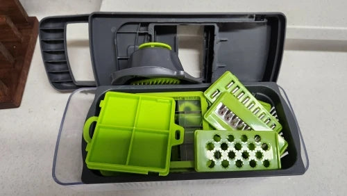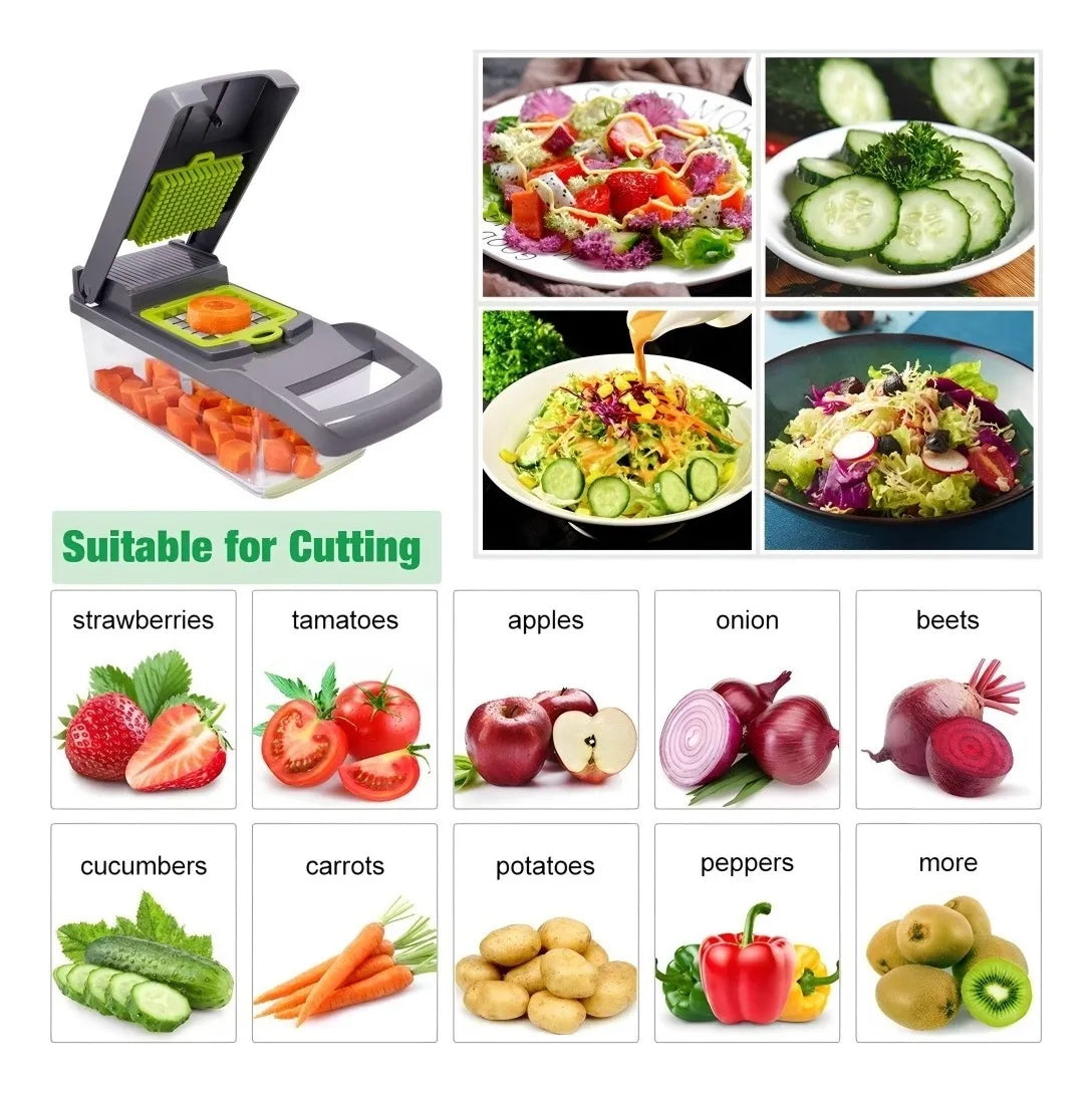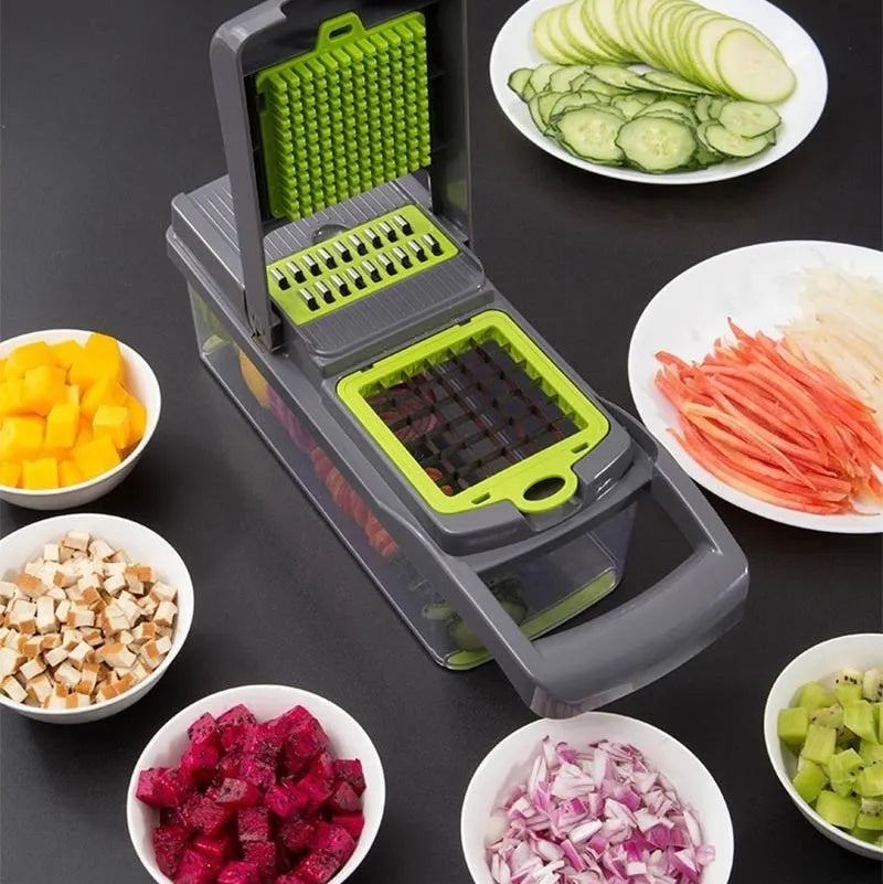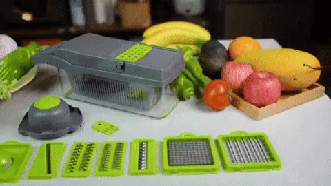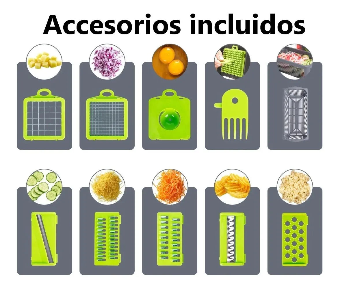 Este es un producto multifuncional. Te permite picar en cubos de varios tamaños, hacer julianas, rebanar en láminas finas, crear cortes decorativos como flores, y hasta rallar o hacer pasta de ingredientes como el jengibre. Ofrece una gran versatilidad para todas tus recetas.