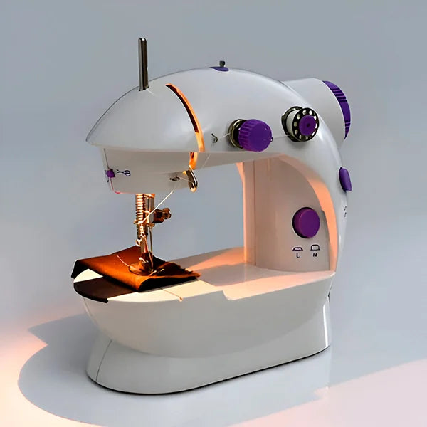 El paquete incluye la mini máquina de coser, el pedal de control, un adaptador de corriente, bobinas y agujas de repuesto, para que puedas empezar a coser apenas la recibas.
